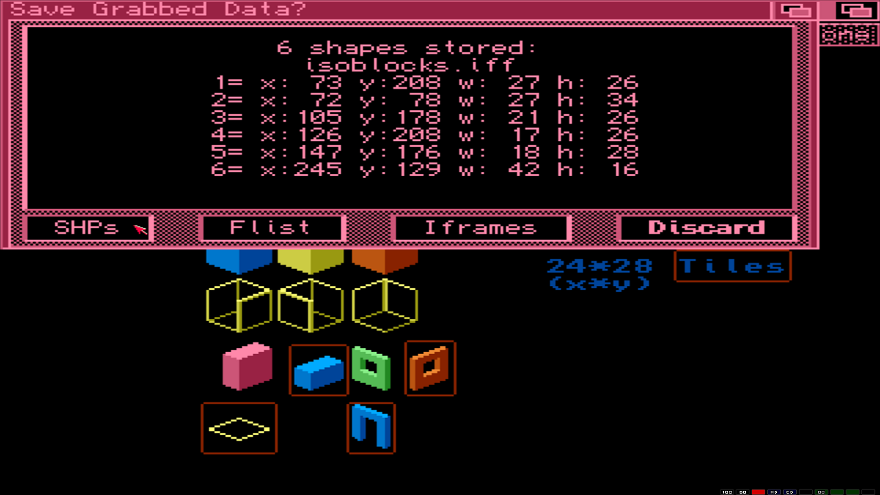 Man kann die Shapes/Sprites wie gewohnt grabben oder halt eine Liste mit den Rect-Coords speichern, um die Shapes später im Programm selbst zu grabben von der BMap.