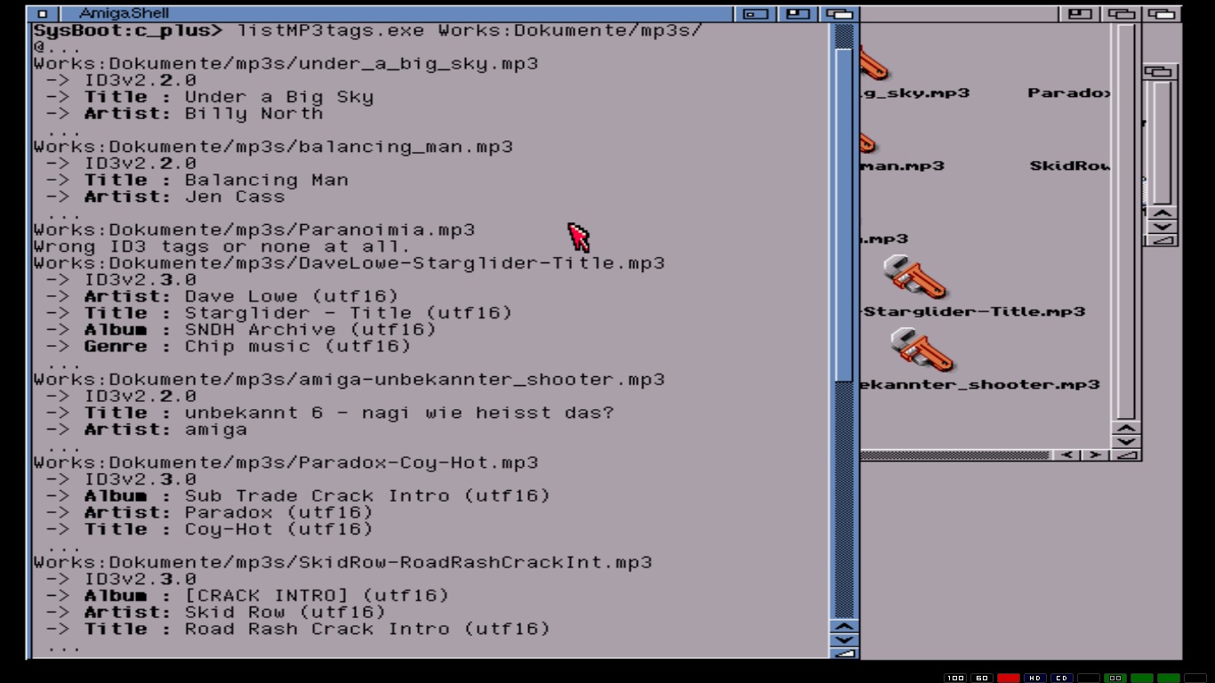 Dieses CLI-Tool durchsucht ein angegebenes Verzeichnis oder Laufwerk, auch rekursiv, und gibt in allen gefundenen MP3s mit V2.x Tags die enthaltenen Titelinformationen aus, also der eingebettete Titel, Komponist etc.